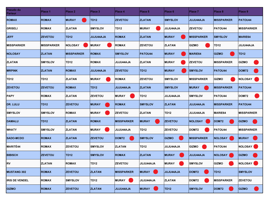 Un GRAND BRAVO à GIZMO, NOLOSAY, MURAY et DOM72 qui se sont battus tout au long de cette 5ème manche et qui se classent respectivement de la 13ème à la 10ème place.